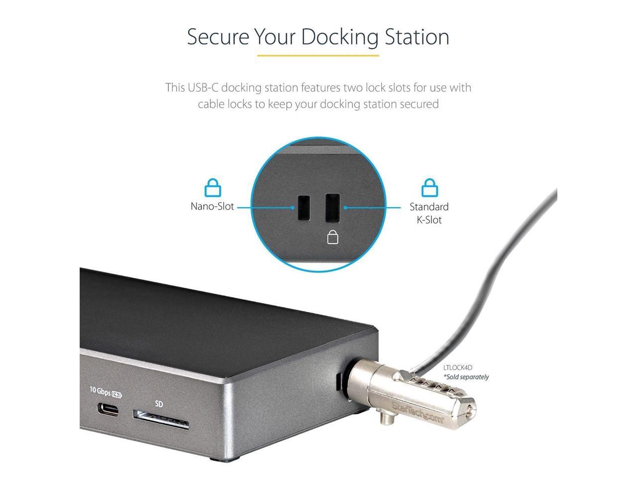 - Deployment Ready: This universal docking station requires no driver setup, features 2x security lock k-slots for added security, an On/Off button for convenience, and a 3.3ft USB-C host cable for easy connectivity.