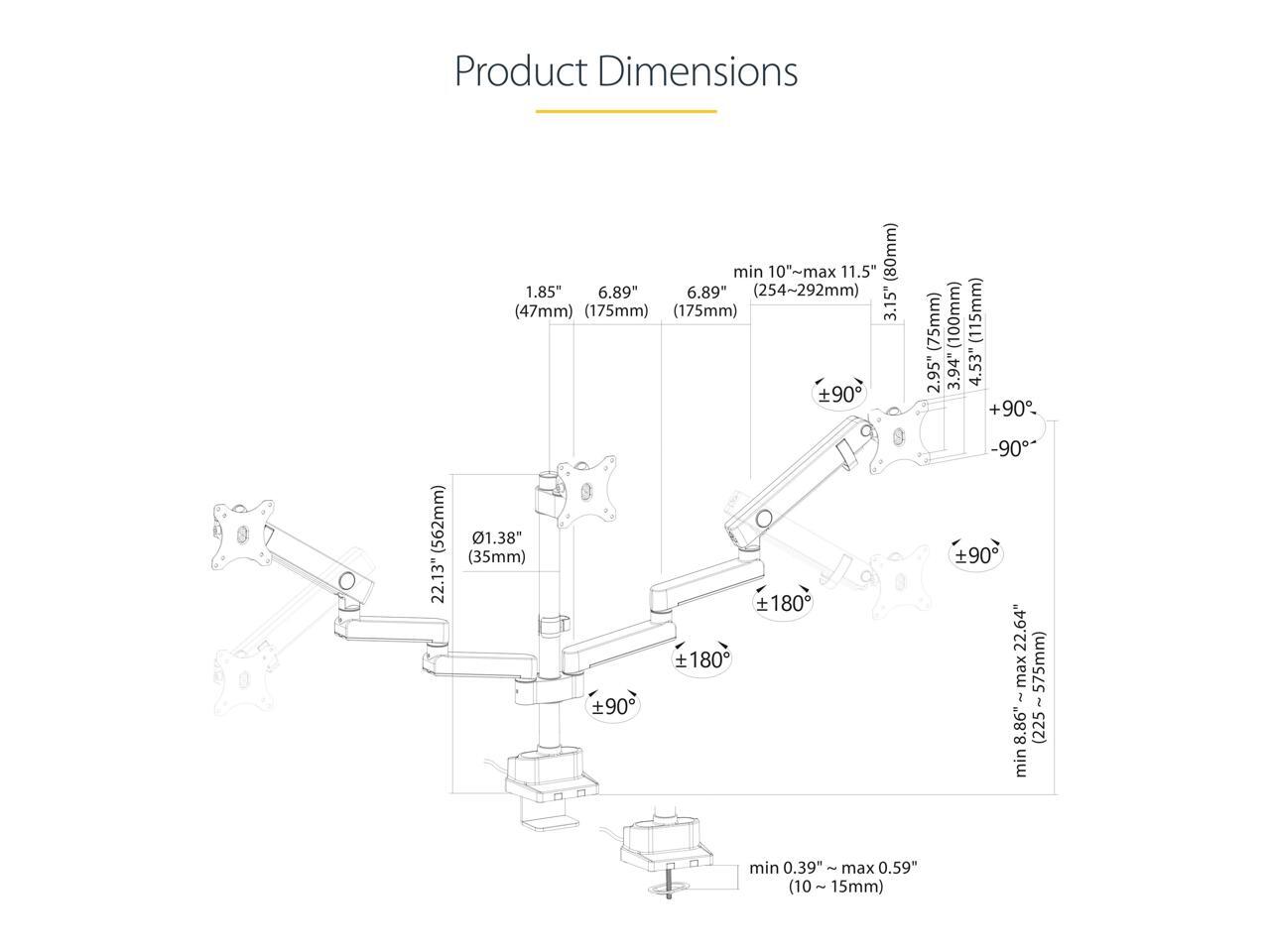 - RANGE OF MOTION: Ergonomic three-monitor mount features articulating mechanical spring arms with toolless adjustments of +/-180° horizontal swivel, +/-90° tilt, and +/-90° screen rotation for portrait and landscape orientations