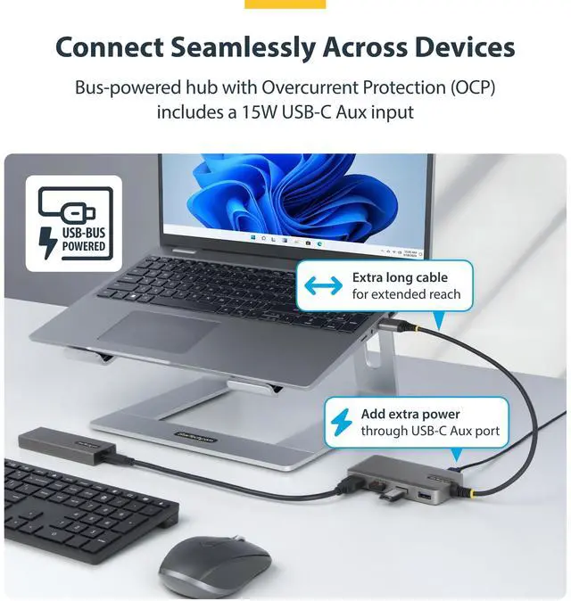 4-PORT USB-A HUB, 5GBPS, BUS POWERED, USB-A TO 4X USB-A HUB WITH USB-C AUXILIARY