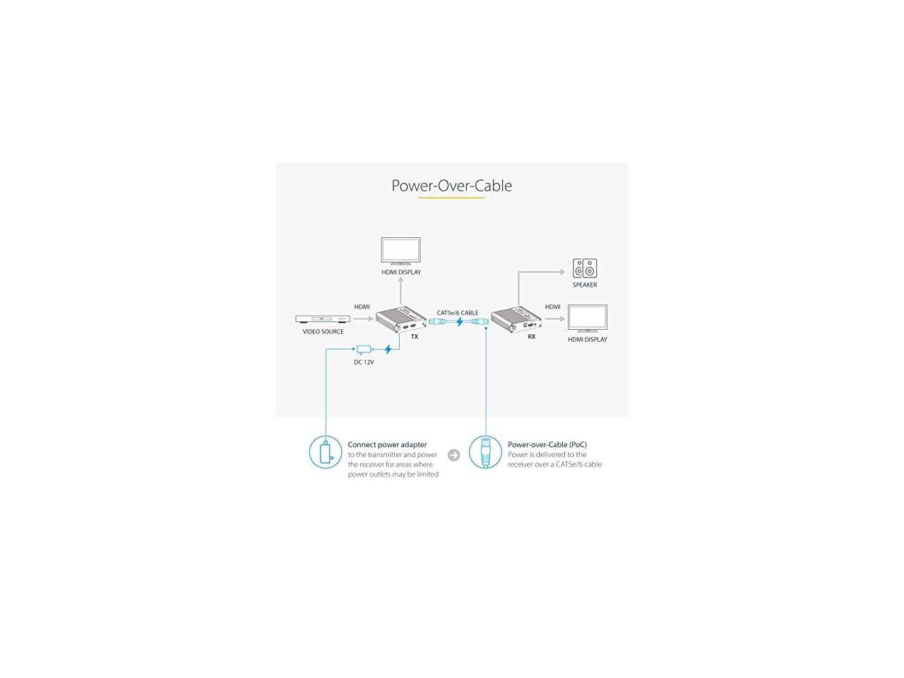 - POWER-OVER-CABLE: Included power adapter connects to the HDMI Extender Kit's transmitter and powers the receiver for areas where power outlets may be limited; Power is delivered to the receiver over a CAT5e/6 cable, using Power-over-Cable (PoC)