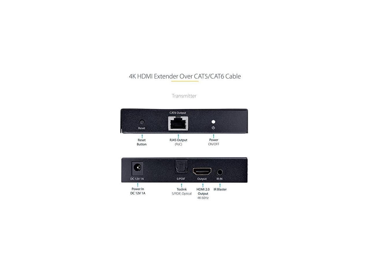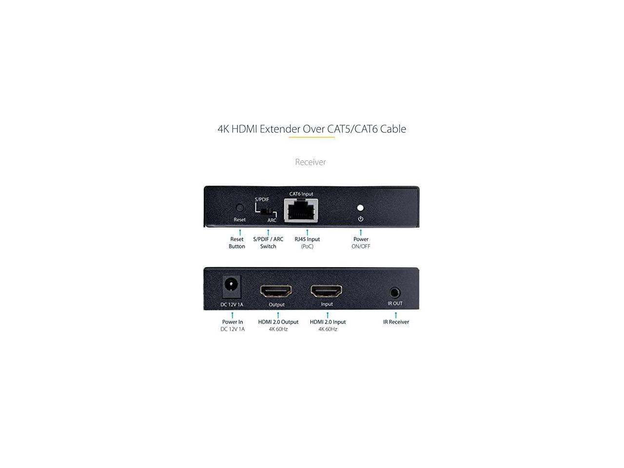 StarTech 4K HDMI Extender Over CAT5/CAT6 Cable, 4K 60Hz HDR Video Extender Up to 230ft (70m), HDMI Over Ethernet Cabling, S/PDIF Audio Out, HDMI Transmitter and Receiver Kit (4K70IC-EXTEND-HDMI)