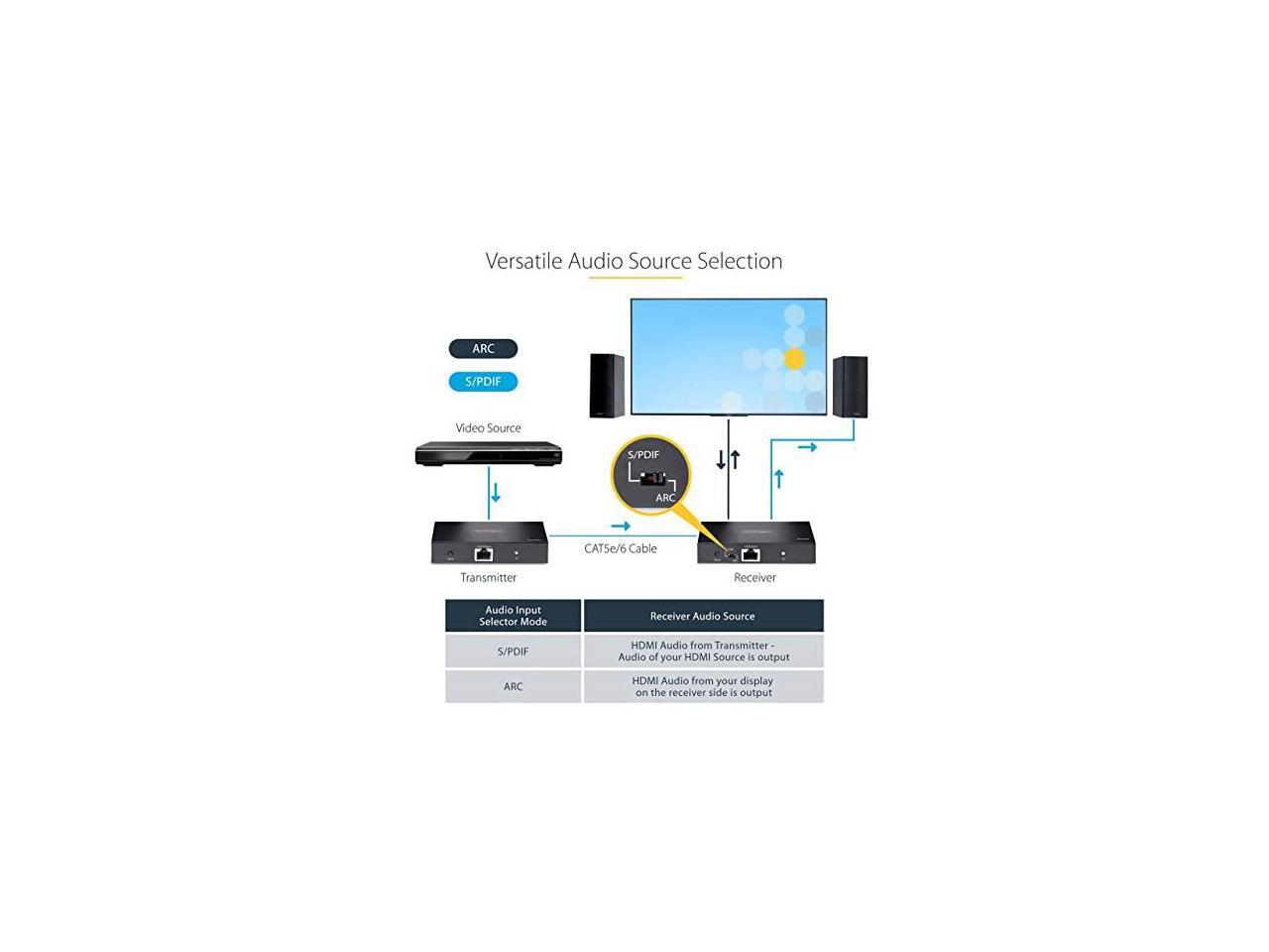 - HDMI OVER ETHERNET CABLING: 4K HDMI Extender transmits 4K 60Hz (4:4:4) video signals and 7.1ch audio up to 230ft (70m) with zero latency over a single CAT5e/6 cable; HDMI 2.0; HDR; HDCP 2.2; HDMI or S/PDIF audio output; DTS and Dolby Digital audio