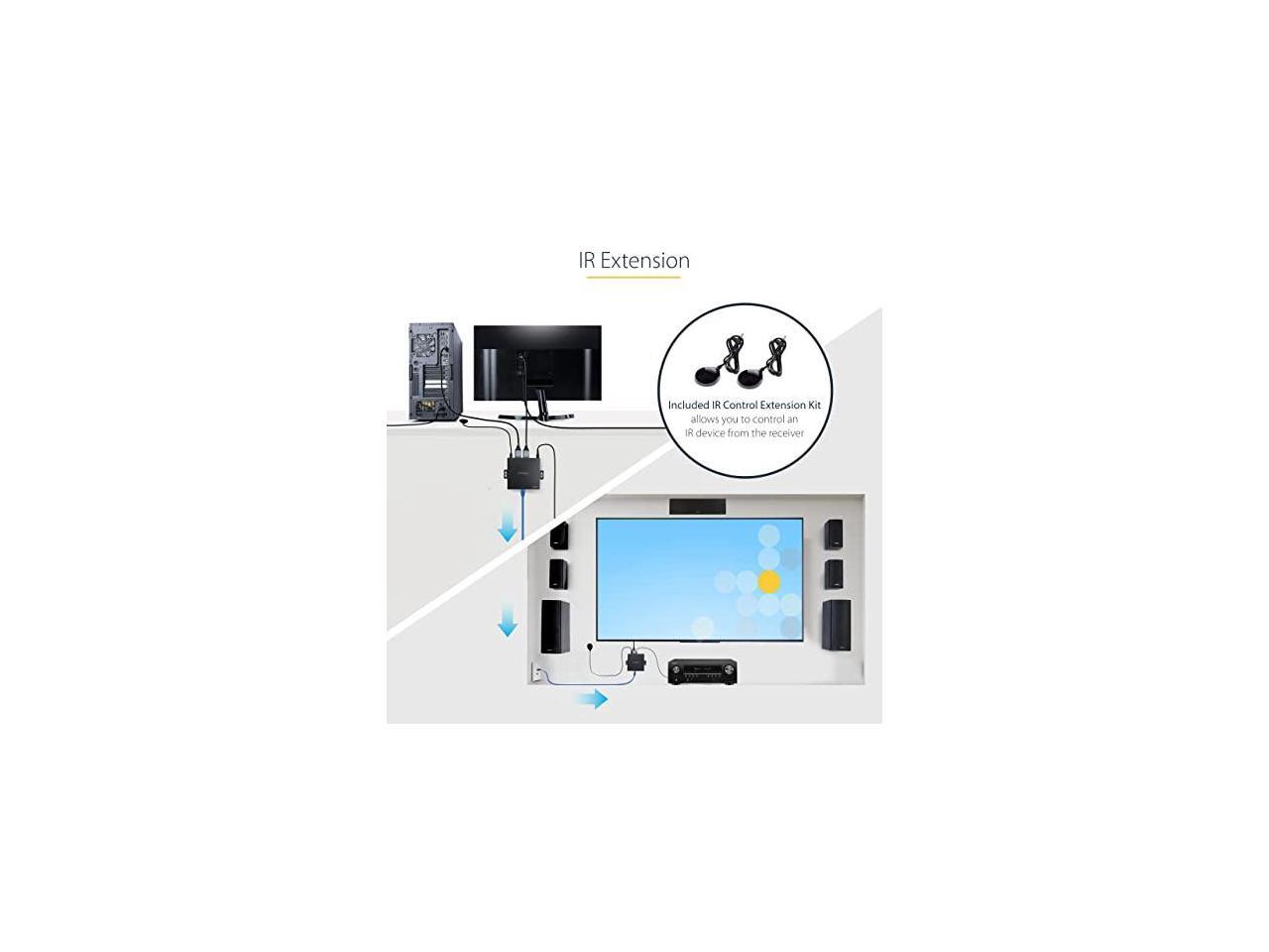 - IR EXTENSION: HDMI over CAT5/CAT6 Extender includes an IR Control Extension Kit, with 1x IR Blaster and 1x IR Receiver, to control an IR device from the receiver; IR Blaster/Receiver feature pre-installed adhesive for convenient installation