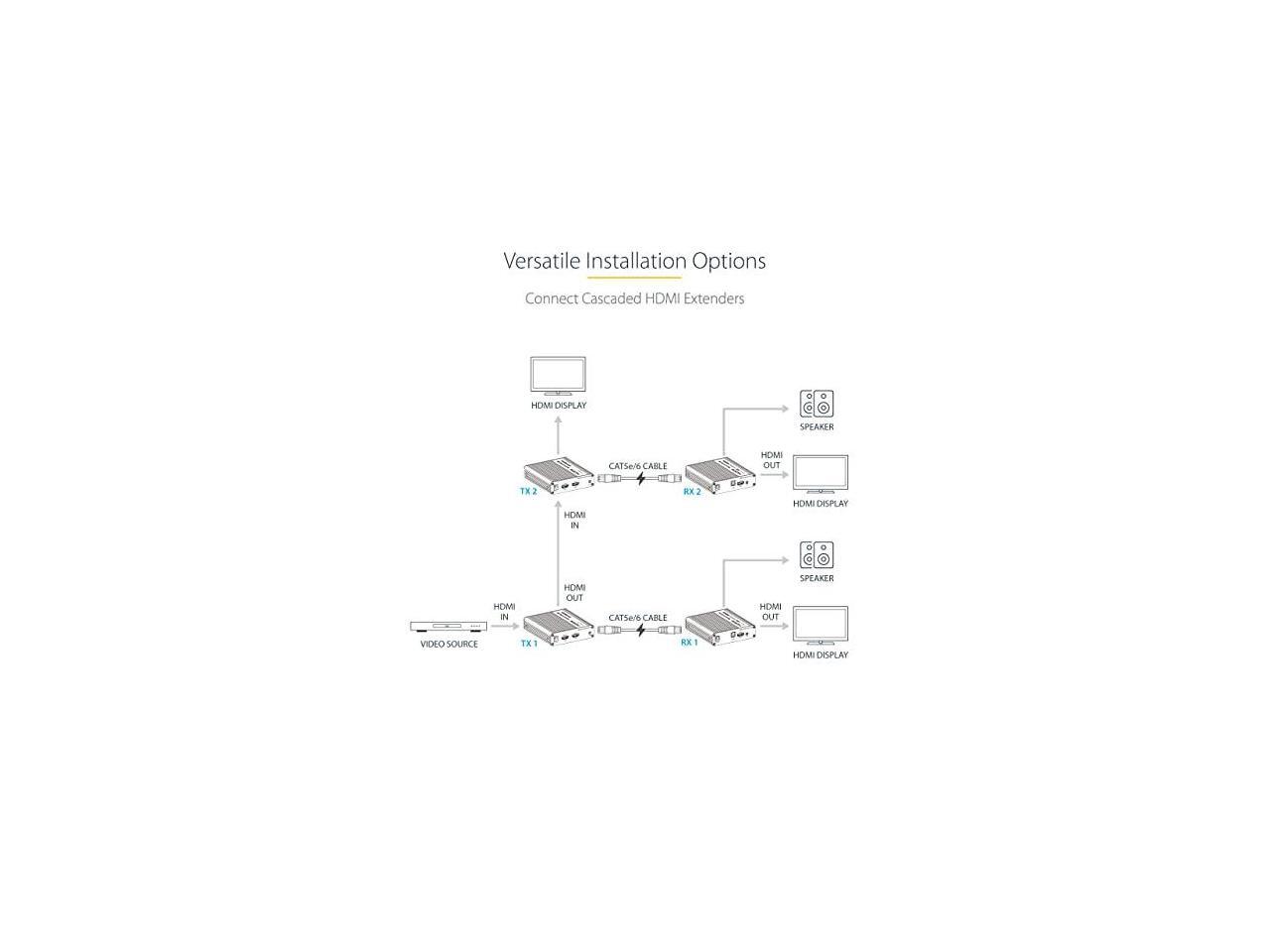 - VERSATILE FUNCTIONALITY: Transmitter features an HDMI output which can be used to connect a local display or to connect cascaded HDMI extenders; HDMI extender over Ethernet Cable is ideal for digital signage in malls, stadiums, and hospitals