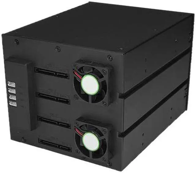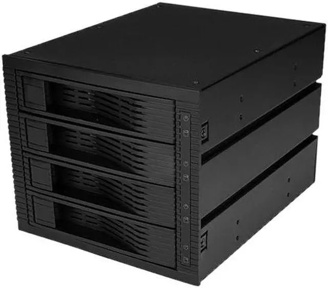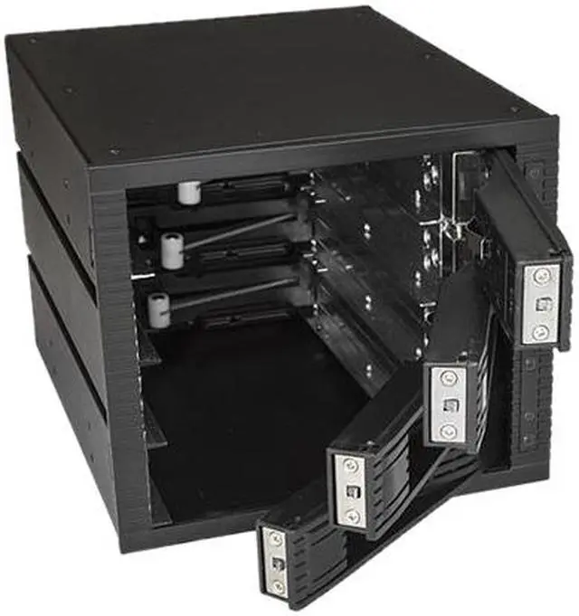Hot swap up to four 3.5" SATA or SAS hard drives using three 5.25" bays