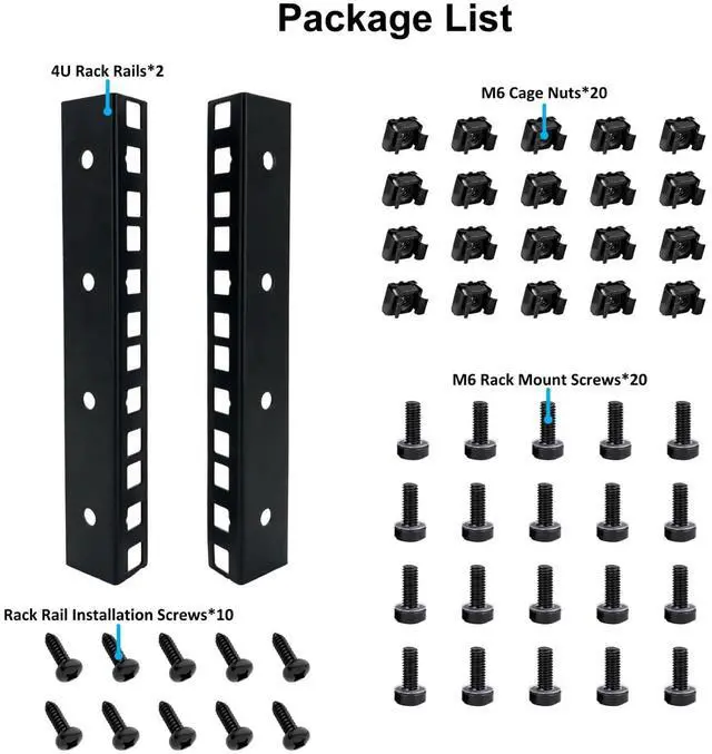 - This set includes two 4U rack rails, 20 sets of M6 x 20mm rack mount screws, 20 M6 cage nuts, and 10 self-tapping screws, giving you everything needed for a seamless installation. The heavy-duty cold rolled steel construction ensures robust support for your servers, switches, and audio gear. Finished in a sleek black powder coating, these rails provide both durability and a professional appearance that blends perfectly with most rack systems.