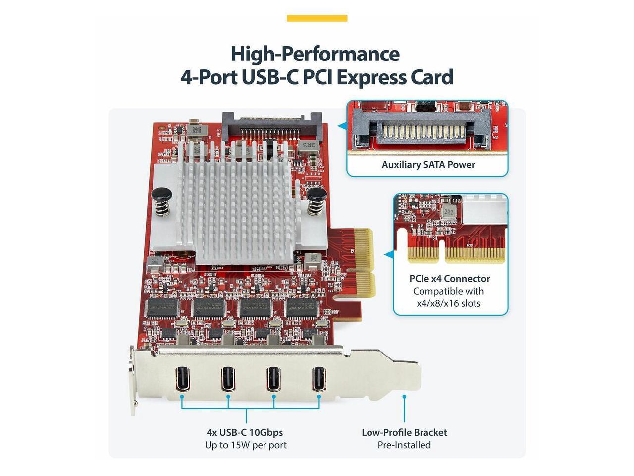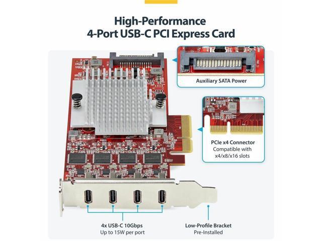 - This USB PCI Express card can provide up to 5V 3A (15W) per USB-C port, enabling sync and charge of portable devices. If the motherboard can't supply enough power, a built-in SATA power connector can supply additional power to the card.