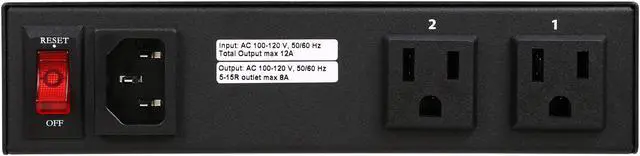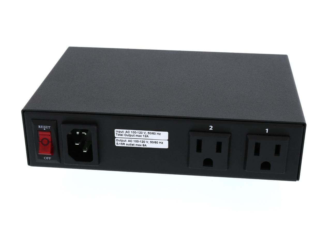 Ports: 2 Input Connector(s): 1 - IEC 60320 C14 Power Plug Output Connectors: 2 - NEMA 5-15 Power (North America) Receptacle Other Interface(s): 1 - RJ-45 Female Max. Current load per Port: 8 A Max. Total Current Output: 12 A Enclosure Type: Steel LED Indicators: 1 - Power, 1 - Reset Indicator, 2 - Per-Outlet On/Off Indicators Input Voltage: 100 ~ 240 AC Power Consumption: 4.5 W