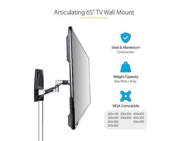 PREMIUM 65" TV WALL MOUNT: Articulating wall mount TV bracket supports TVs up to 65 inches; VESA patterns from 200x100 up to 400x400; Max weight capacity 99lb (45kg); Durable and sturdy frame with silver finish; For flat or curved screen TVs