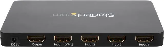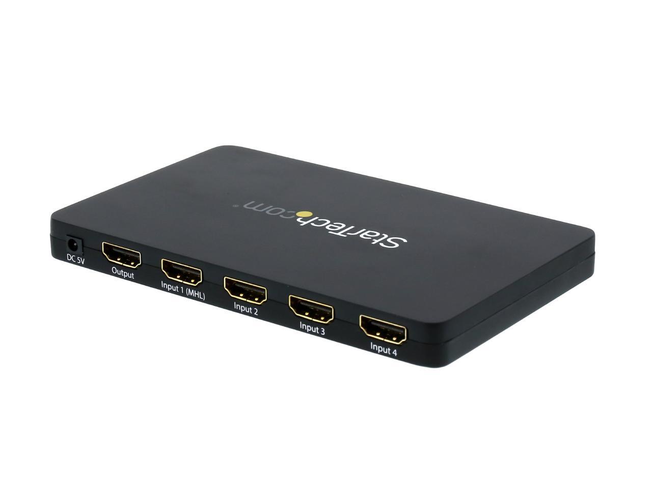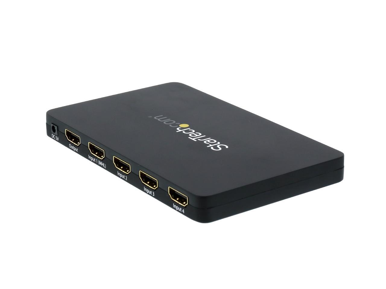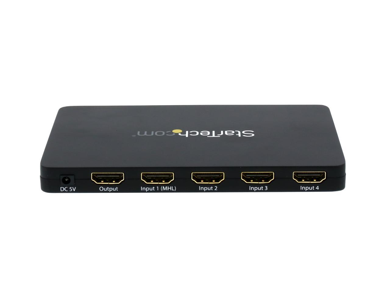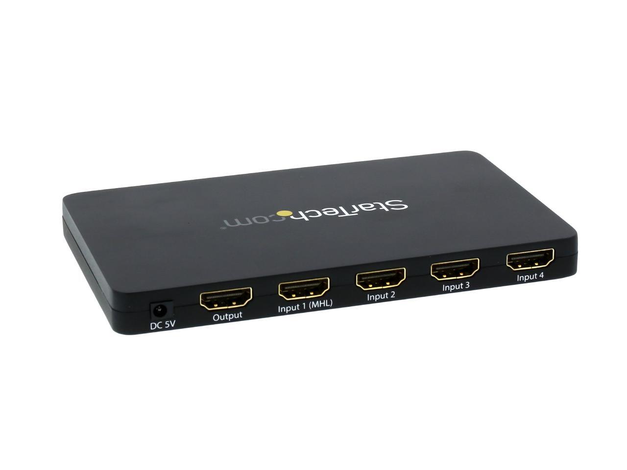 The VS421HD4K 4-port HDMI 4K switch lets you share a display or projector with four HDMI-enabled audio / video source devices. The switch features four independent inputs that each support 4K resolution and 7.1 surround sound audio. The 4-port switch also features MHL support on HDMI input port 1, enabling video output video from MHL-enabled mobile devices such as Samsung Galaxy tablets and smartphones.