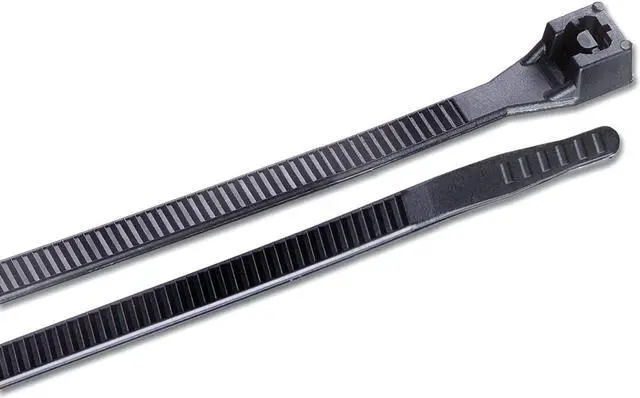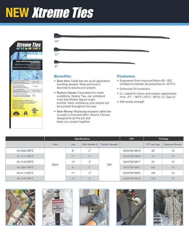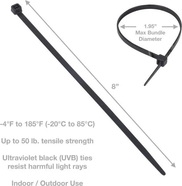 DESIGNED FOR RUGGED ENVIRONMENTS demanding HEAVY BUNDELING and LARGE BUNDLE DIAMETERSEngineered from improved Nylon 66 and ISO certified to maintain their properties down to -40°g F/CUL listed for indoor and outdoor applications from -4°F to 185°F (-20°C - 85°C)8 inch Length & 50 lb. tensile strengthPatented design with LOCKING TEETH on both sides of the tie ENSURE A STRONGER CONNECTION