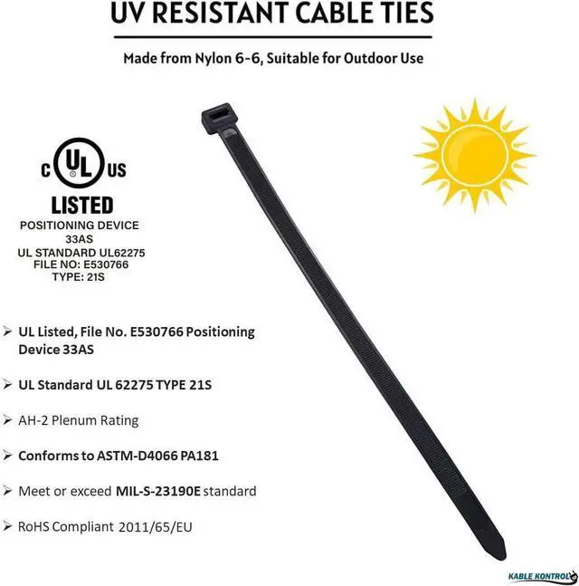 Listed: Our zip ties are UL Listed File No. E530766 Positioning Device 33AS UL Standard UL 62275 TYPE 21S ROHS compliant are Military and Federal Grade | ASTM- D4066 PA181