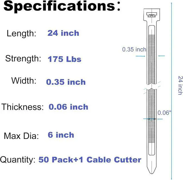 Package Including: 50pcs x 24inch black strong large zip ties; 1Pc x Cable