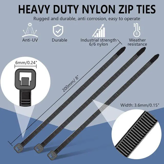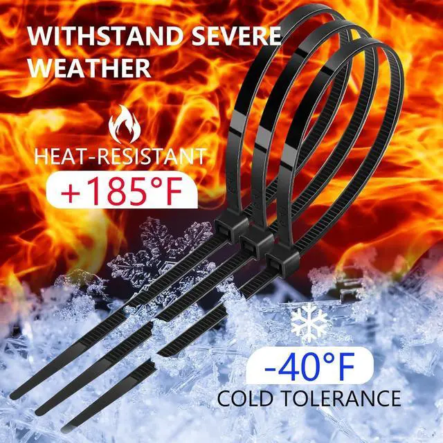 50LB Heavy Duty Zip TiesWith a tensile strength of up to 50 pounds and thickened nylon 66 material our black zip ties are tough durable and resistant to breaking providing reliable fixation for daily organization or light construction. Heat and Cold ResistanceThe working temperature range of the black cable zip ties is -40°F to + 185°F. It can be used normally in extremely cold or hot environments. It has UV protection function is resistant to high temperatures and severe colds and is not easy to age after long-term outdoor use. Self-Locking Design Zip TiesThis type of black zip ties adopts precision self-locking design which automatically locks the position when in use and will not loosen or slip off after binding ensuring firm fixation easy operation and safe and reliable.