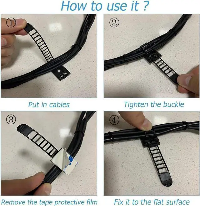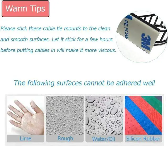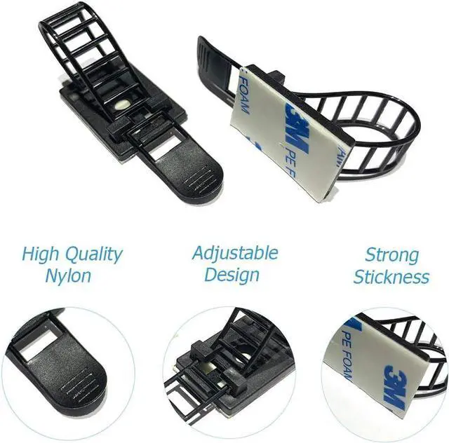 ADJUSTABLE DESIGN: Black adhesive cable ties with adjustable design for meeting your cable management needs. You can adjust it based on your cable sizes and quantities. The zipper design can help you open and close it easily and quickly. There is also a small hole on the mount so that you can also use your own screw to fix it. Generally the adhesion of self-adhesive pad is strong enough.