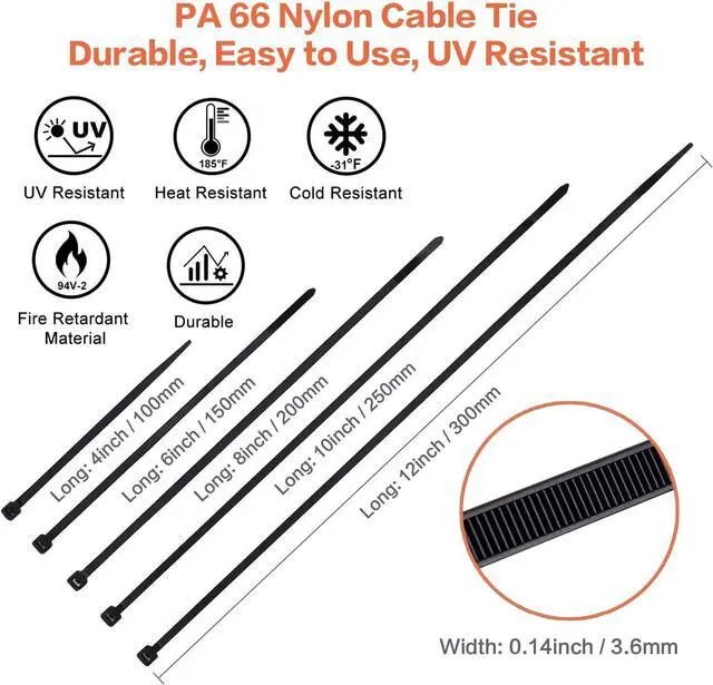 High-Quality Plastic Ties: Made of industrial strength nylon 6/6 fire resistant material the cable straps are flexible to be used in temperatures ranges from -31 to +185 (-35 to +85) uv resistant for outdoorPc