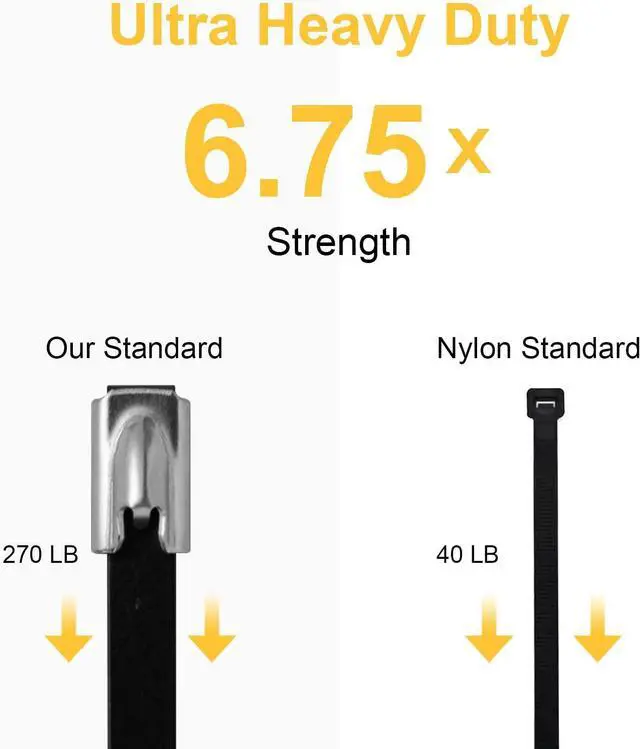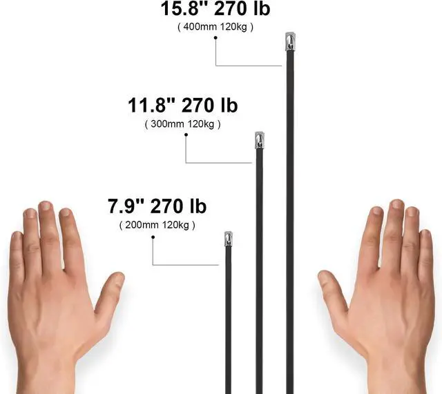 [Premium Stainless Steel Cable Zip] Made of all 304 material the stainless steel cable tie comes with excellent acid and alkali resistance abrasion resistance and anti-aging. [Flexible and Strong Bearing Capacity] These cable ties are made with a special flexible process which is flexible and convenient for strapping. The zip ties heavy duty is high in strength and provides a maximum bearing capacity of 270 pounds. [Size and Design] Advanced cold rolling technology makes the product more compact. The product is 15.8 in long 0.18 in wide 0.01 in thick and the maximum bundle diameter is 4.02 in.