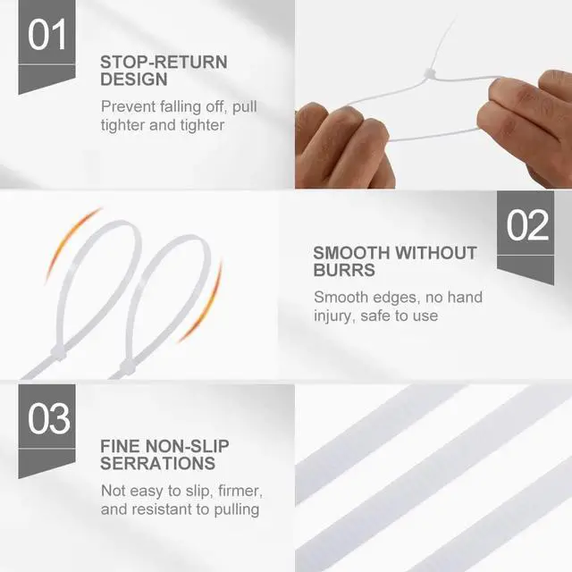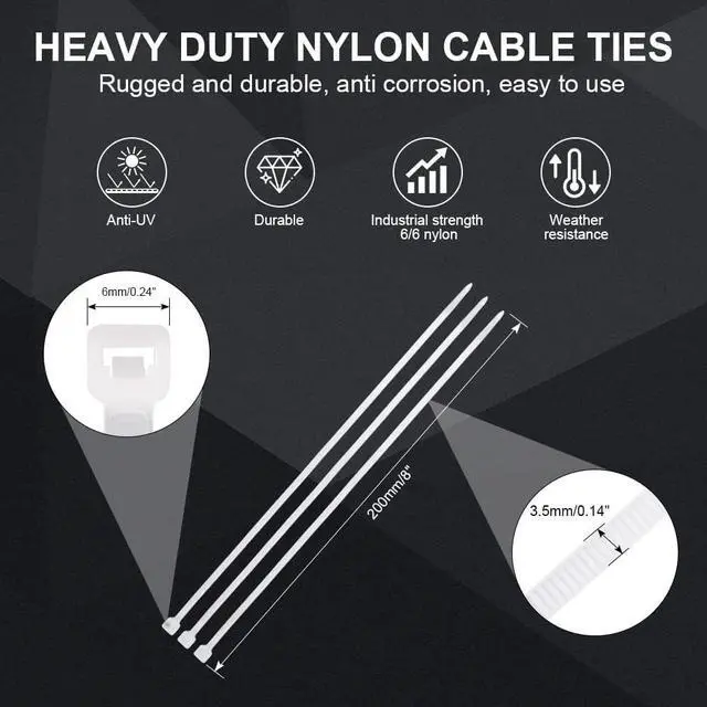 Infinite Applications - Zip ties are one of the most versatile tools in the world. You can use cable ties to secure cables wires bundle decorations or even hang garden plants we've got the perfect solution for you! Premium Quality - Zip ties heavy duty are made of high quality industrial strength 6/6 nylon to ensure extended durability and they have a tensile strength of up to 40 lbs. Heavy duty zip ties are weather resistant and can withstand the harshest weather conditions (operating temperatures of -40°F to +185°F). Self-Locking Design - Each white zip tie has a durable self-locking mechanism that locks very securely and will not budge over time and the locking teeth stop the cable tie at the desired length.