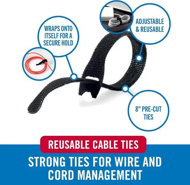TO ZIP TIES: Eliminate the waste of traditional zip ties VELCRO Brand reusable cable ties can be used and reused multiple times the reusable zip ties alternativeWIRE AND CORD MANAGEMENT - These cable ties heavy duty fasteners are perfect for cord organization wire management and securing loose or extra-long cords out of the wayWIRE ORGANIZING SELF BUNDLING STRAPS - Secure large cords and bulky cables these cable ties reusable VELCRO brand straps; get organized fast with simple to use self-fastening ties that store cords and wires quickly and safelyPRE-CUT LENGTH - Adjustable to suit different circumferences; simply insert the rounded end through the hole and pull the strap tight; reusable cable ties firmly wrap onto themselves for a secure hold