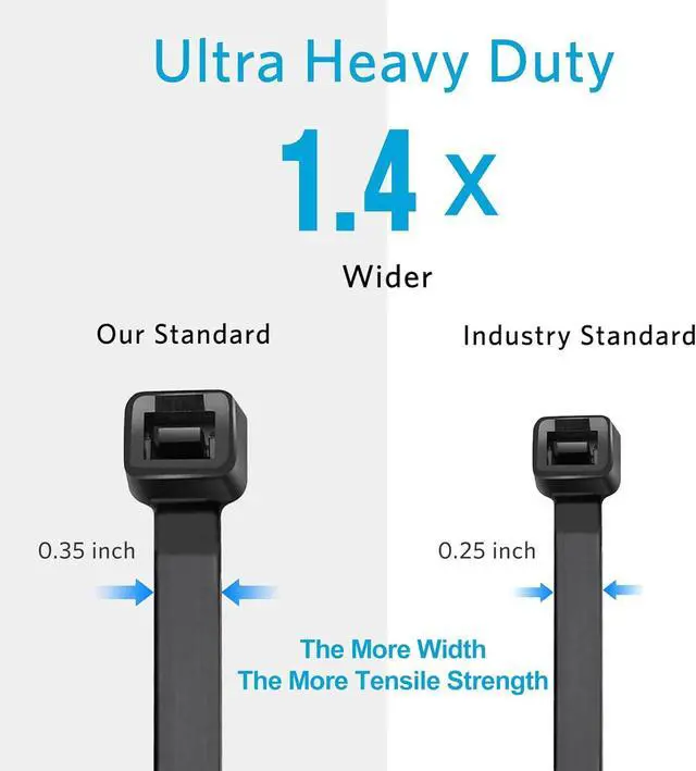 Heavy Duty: The width of our 24 inch zip ties is 0.35 while industry standard is 0.25 heavy duty zip ties provide 200 lbs tensile strength.