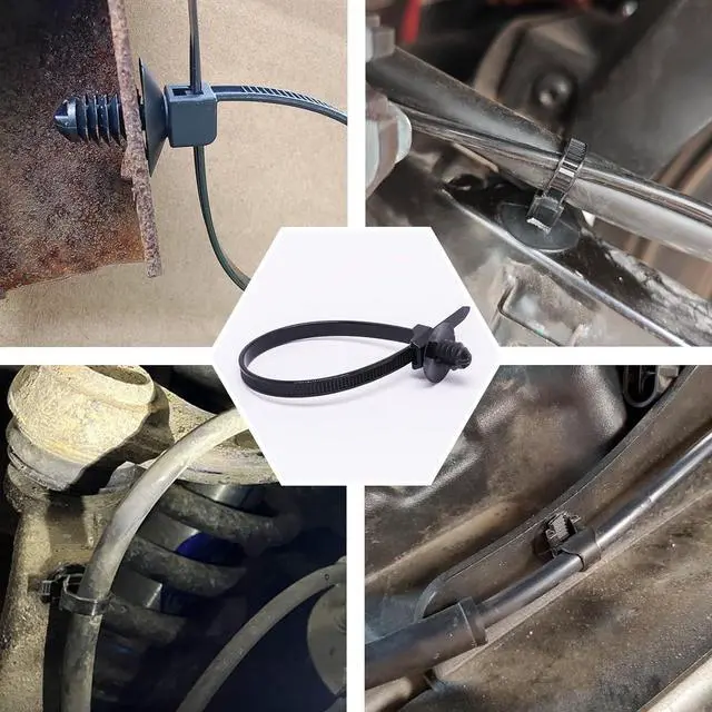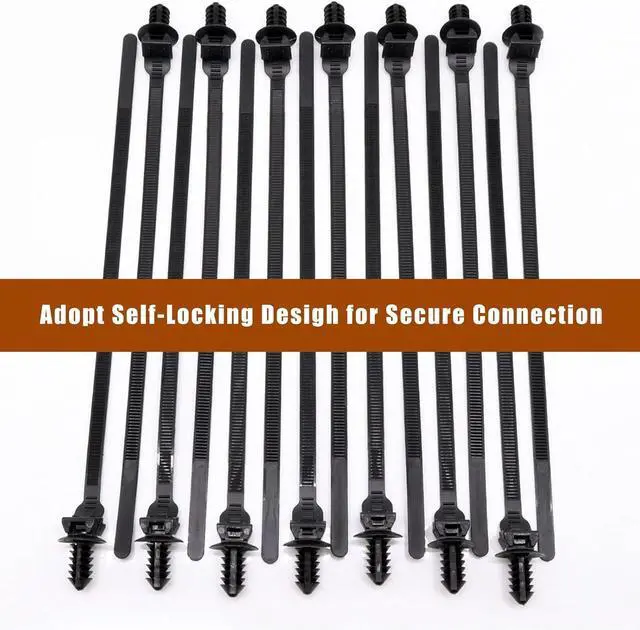 Design: Self-locking with push mount design easy to use the gears are clear good insulation. Its a tie-wrap with a fastening clip perfect to replace in most cars wiring harnessApplication: Widely used in household construction electronic auto cable and wire assembly. Good for anchoring cables (and small hoses/ tail light wire harnesses/ secure wires/ Wire Harness Clips/ factory zip tie clips/ secure spark plug wires) and is equivalent replacement for similarly factory installed wire loom tiesPackage