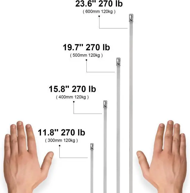 [Premium Stainless Steel Cable Zip] Made of all 306 material the stainless steel cable tie comes with excellent acid and alkali resistance abrasion resistance and anti-aging. [Flexible and Strong Bearing Capacity] These cable ties are made with a special flexible process which is flexible and convenient for strapping. The zip ties heavy duty is high in strength and provides a maximum bearing capacity of 272 pounds. [Size and Design] Advanced cold rolling technology makes the product more compact. The product is 23.6 in long 0.18 in wide 0.01 in thick and the maximum bundle diameter is 7.48 in.