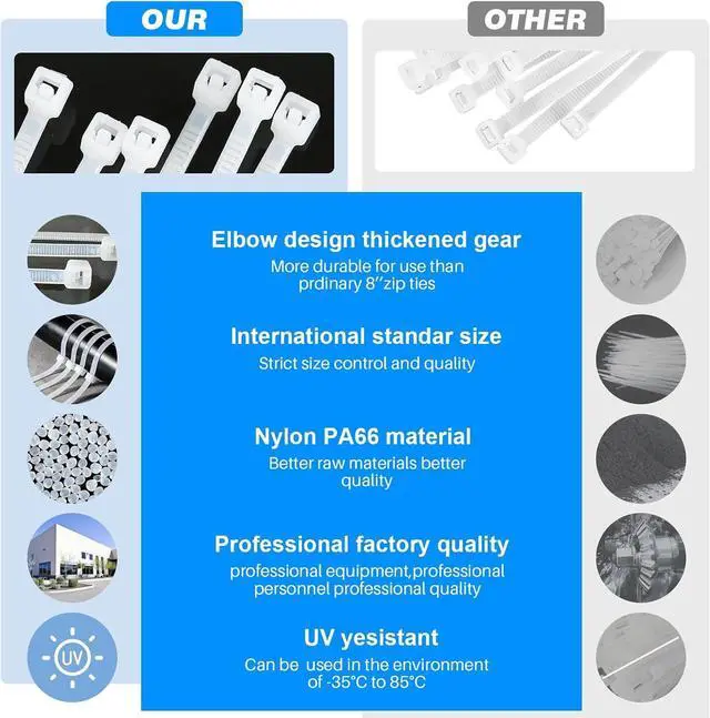 Premium Quality Material: Plastic wire ties clear made of industrial strength nylon 6/6 new material and can be used in temperatures from 040F to +185F (440C to +85C) weather resistant and outdoor in sunlight direct are not an issue. Strong and DurableNylon white zip ties 8 inch withSelf-locking fastener design sturdy and durable with a strong Ratchet-Lock design and dense teeth are more durable for use.