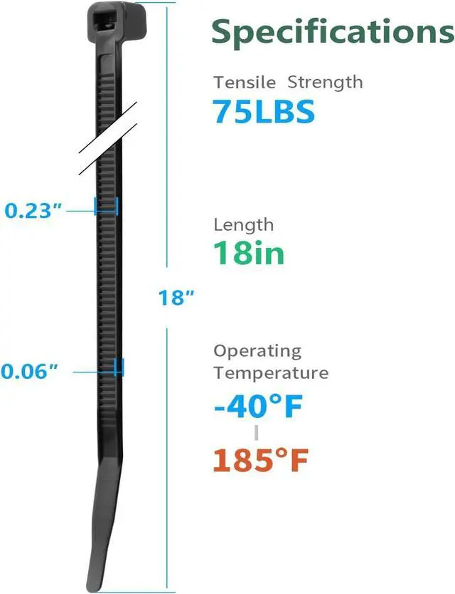 Great DesignSelf-locking fastener design sturdy and durable easy to operate. The width of our cable tie is 0.22 inch/ 5.8 mm which makes the cable tie stronger than the same size cable tie on the market and tensile strength could handles most purpose of binding in life. High-Quality MaterialIndustrial-strength nylon 66 fireproof material is used which can be used in the environment of -35 to 85 Features strong load ability anti-aging anti-acid anti-corrosion and durability. Easy-UsingYou only arrange the things to be bundled and then bend one side of the small saw blade inward pass the arrow through the other part of the button and easily pull it.