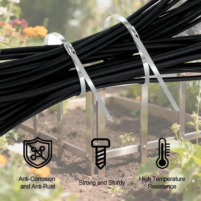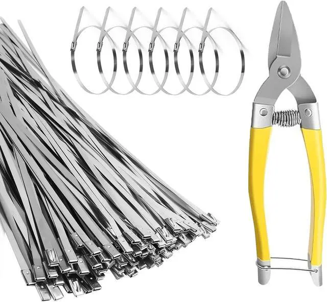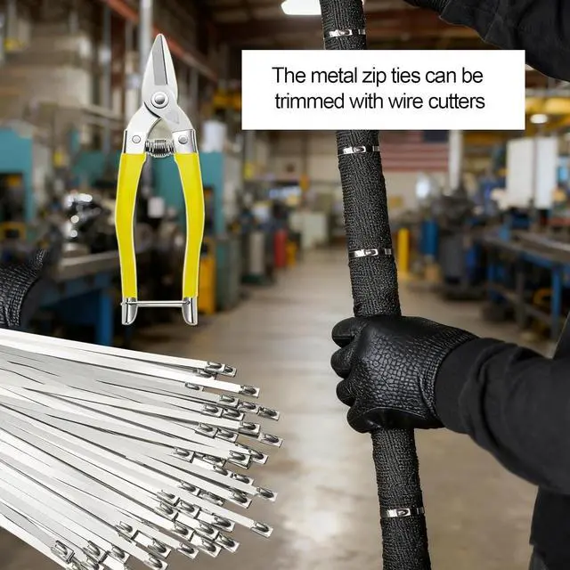 They work for both small clear ties and large projects requiring long ties. FEATURESOur heavy-duty outdoor metal zip ties with wire cutters feature a durable epoxy coating resisting high/low temperatures rust and corrosion. Made of stainless steel theyre built for long-lasting outdoor use in applications like electrical wiring and garden installations. MULTIPLE USESThese versatile metal zip ties are suitable for machinery vehicles gardens farms cables and pipes. Built for harsh outdoor environments they excel at securing safety wires and serve as reliable stainless steel cable ties for various outdoor projects.