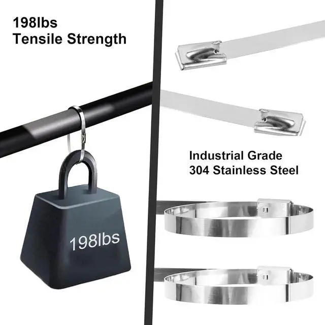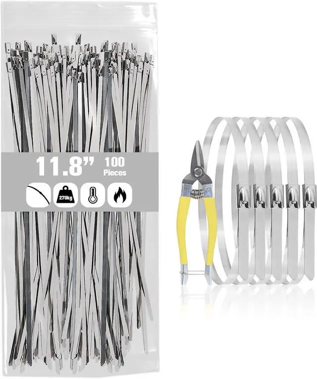 SIZE & QUANTITYEach metal zip tie measures 300mm x 4.6 mm x 0.25 mm ( 11.8 x 0.18 x 0.01 ) and the pack includes 100 piecesperfect for large or recurring projects. Use them to secure cord ties wire shelf clips and more. PHYSICAL PROPERTIESConstructed from 304 stainless steel these outdoor heavy-duty zip ties support up to 90lbs and withstand temperatures from -170°F to +500°F. Ideal for bundling electric fence wires or securing wire mesh they suit both short ties and 11.8 -inch lengths. EASY TO USEDesigned with a self-locking mechanism these heavy-duty outdoor metal zip ties with wire cutters can be tightened with sharp-nosed pliers and trimmed with wire cutters or tin scissors.