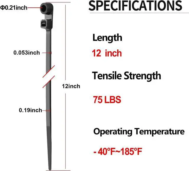 High tensile strengthPack of 200 12 Inch Long Black Cable Zip Ties. Heavy Duty Cable Ties with supporting up to 75LBS Strong Tensile Strength. 0.2 inch WideHigh QualityThese Screw Wire Mounting Hole Zip Ties are made of nylon 6/6 plastic with good weather resistance can be used in temperatures ranging from -40°F - 185°F. The cable tie mount have good insulation and not easy to aging. More StableMounting Head zip ties's mounting eyelet can hang cables power cable etc. The ratchet-lock head has a 5.4 mm screw hole. You can use screws nails etc along with the zip tie for extra security and flexibility.
