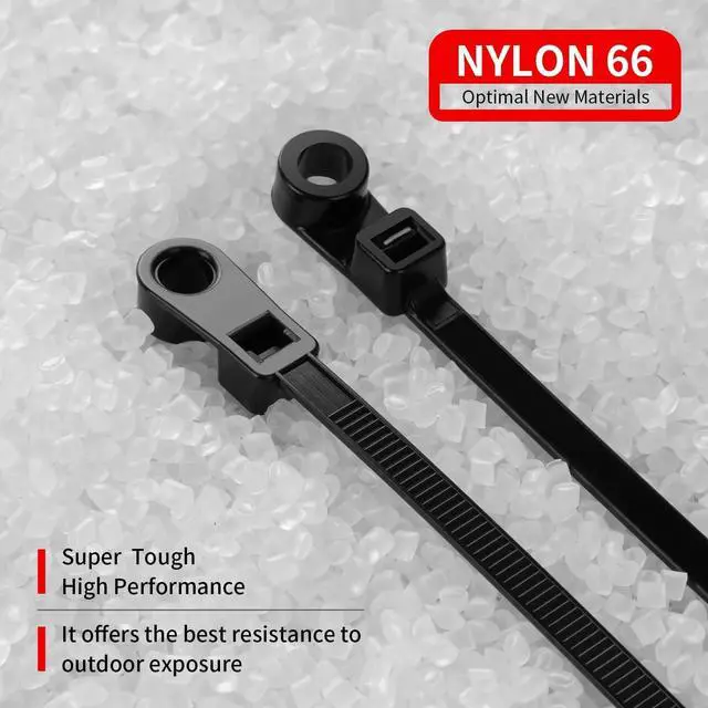 FeaturesThe zip tie can bundle cables securely and tightly as its self-locking design. With the screw hole eyelet tie head with eyelet could hang able insulated and weatherproof the teeth engage as they should self-locking design ensure bundle wires more tightly and secureWide ApplicationThe zip tie mounts with screw hole can secure most of cables and items such as thick or thin extension wires ethernet cables plant branches fences packages etc. Screw zip ties will be great helper for your home garden office workshop garage industrial and other places.