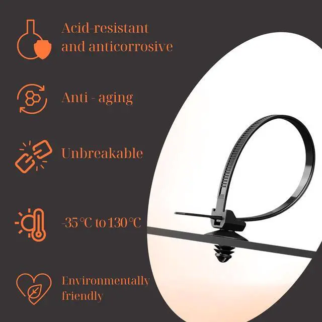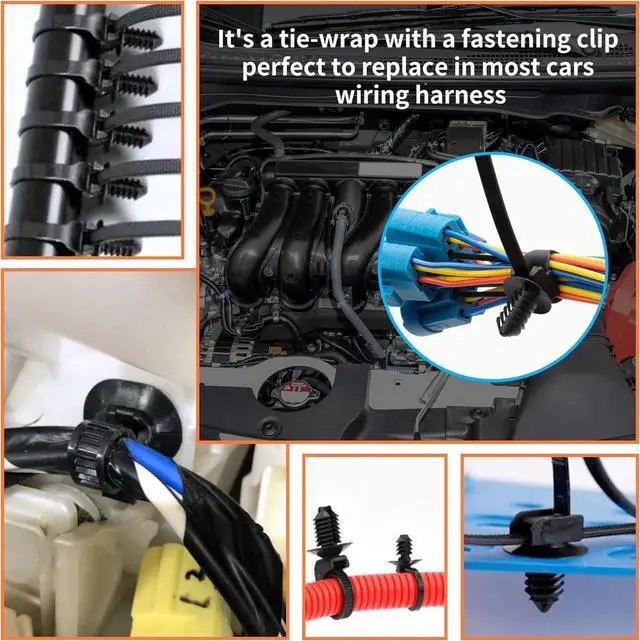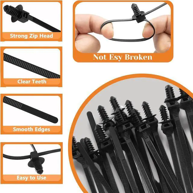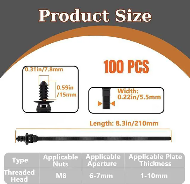 Size: 8.3 x 0.22 /210mm x 5.5 mm. These cable ties to be useful for various outdoor and gardening tasks such as outdoor holiday decorating plant tying general use attaching cords to metal surfaces and tethering objects to a car or metal table organize wires hang LED lights and banners repair plant branches and repair garden fences. They appreciate the versatility and durability of these cable ties in these applications. ULTRA-DURABLE PUSH MOUNT CABLE TIES - Engineered from heavy-duty nylon our push mount zip ties are designed for automotive excellence. Perfect for securing wiring harnesses fuel lines industrial applications and more in engine bays and marine environments alike. VERSATILE AND SECURE WIRE MANAGEMENT - Ideal as quick-release wiring harness mounts or engine bay wire retainers our push mount cable tie clips cable tie mount provide reliable fastening in automotive electrical systems and beyond. UV-RESISTANT AND LONG-LASTING - Industrial-strength nylon 66 fireproof material is used which can be used in the environment of -35 to 85 Features strong load ability anti-aging anti-acid anti-corrosion and durability. It also has a strong overall flame retardant effect which can reduce fire hazards. EASY INSTALLATION FOR EFFICIENT CABLE ORGANIZATION - Featuring a self-locking design our push mount wire ties are easy to install Widely used in household construction electronic auto boats cable and wire assembly Can be used to bundle and sort various cables and wires such as the fixing of wires of lighting oil pipelines of mechanical equipment etc.