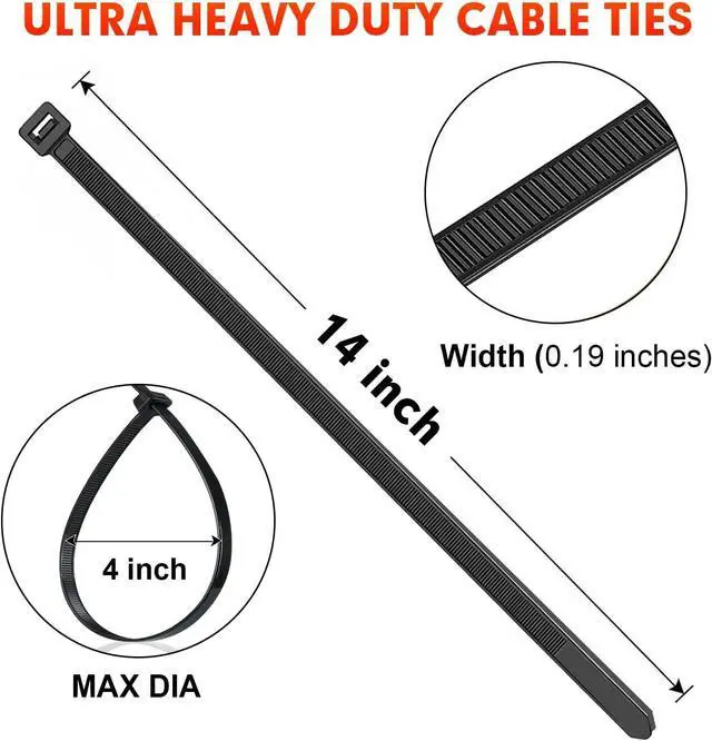 INCLUDED: RAZCC black zip ties is 14 in length and 0.19 in width its max diameter is 4 inch package includes 1200 pieces it's enough for your projects or daily use50LB