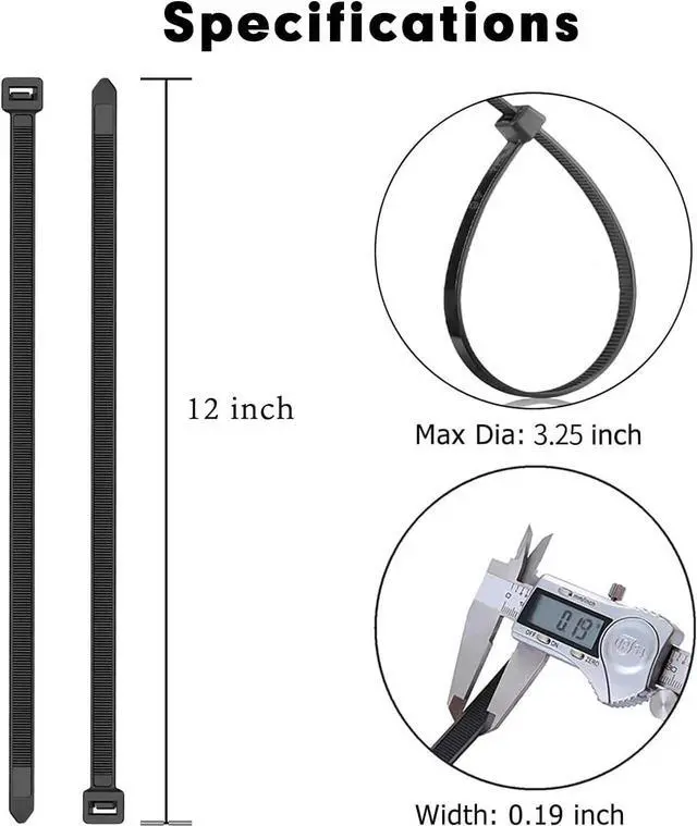 HIGHER TENSILE STRENGTH: Compared to the industry standard of 0.14 inches ( 3.6 mm) our 12-inch cable ties are 0.19 inches ( 4.8 mm) wider and 0.05 inches ( 1.25 mm) thicker with a higher tensile strength to withstand up to 50 lbs. of weight.