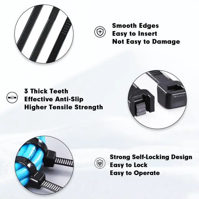 SELF-LOCKING DESIGN: Black nylon cable ties feature a self-locking mechanism for safe and secure tightening. Thick buckle with teeth and anti-bounce design will not come off easily can be locked easily and not easy to come off.