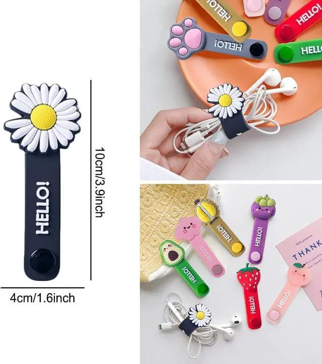 Keep It TidyButton design that only takes seconds Keep your earbuds or chargers small accessories headphones and USB cables organized Protect laptop cables and power cords from fray and keep your desk away from pulling on charging cables. Easy to CarryCable Ties are Made of Eco-friendly Dust-proof silicone Soft and flexible resilient to tearing and pulling. Each weighs 0.35 ounces (10g) 1.6 * 3.9 inch (4*10cm) Ideal for home school office traveling. Multiple Colors & PatternsVarious bright colors with cute designs such as yellow daisies clouds durians strawberries mangosteens avocado etc. Customer ServiceWe will provide you with 24-hour customer service and 12-month warranty.