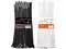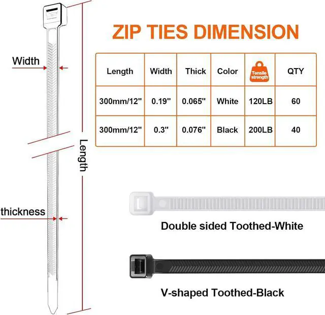 Heavy Duty Zip Ties 200LBS: The more width and Thickness the more tensile strength. our zip ties 12 inch width is 0.3 inch( 7.6 mm) while industry standard is 0.19 inch( 4.8 mm) our zip ties 12 inch Thickness is 0.065 inch( 1.65 mm) while industry standard is 0.05 inch( 1.25 mm) more tensile strength. White cable ties are 120LBS.? 8-Point High Quality Black & White Zip Ties: Double sided tooted Patented Design Premium nylon66 UV-resistant Fire-resistant Prevent-freezing Sturdiness durability and weatherproof so in snow and direct sunlight is not a problem. Believe in the Power of