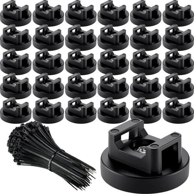 Practical combination: the package includes 30 pieces of 31 mm magnetic cable tie mounts and 150 pieces of nylon cable zip ties 120 pieces in total and each magnet can withstand a maximum vertical pull of approx. 11.5 pounds offering sufficient quantity for your daily demands and bringing you lots of conveniencesNice performances: the black magnetic zip tie mounts with self locking cable ties are practical accessories to fix and organize your different wires and cables which can reduce the cable clutter and bring you neat conditions; And the magnet bases are designed with protective rubber which can enhance the lateral load carrying capacity keep the magnets clean and protect located surfaces from scratchesConvenient applications: the multipurpose magnet wire holders are convenient to use just fix them on metal areas insert the zip ties to attach the cables or wires then tighten them and cut the excessive length; They are removable and you can easily adjust the positions and angles as you needLong lasting to use: the black magnetic zip tie mounts are made of NdFeB magnets A3 steel rubber and nylon sturdy and reliable in quality and the proper magnetism makes them not easy to fall off from metal surfaces; The black zip ties are made of nylon ensuring nice strength and long term application.
