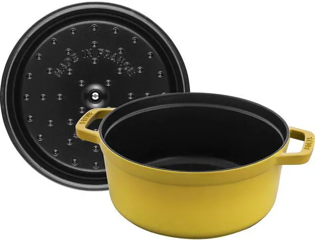 The Staub cocotte is unsurpassed for slow-cooking meats and vegetables to tender perfection, and for simmering hearty stews and soups. Cast iron possesses exceptional heat-retaining qualities, so the pot heats evenly throughout. The innovative lid features tiny spikes on the interior that continually release condensed liquid back onto the food, yielding moist, flavorful results.