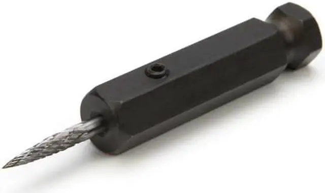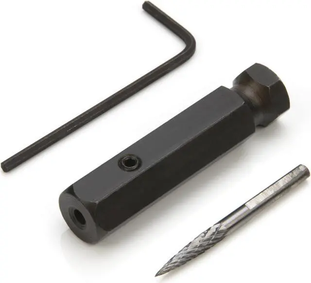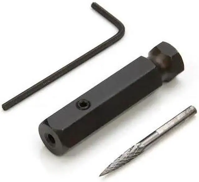 One of the main steps in the Rubber Manufacturer's Association tire repair procedure for pneumatic tires is to make sure the tire injury has been cleaned out in preparation for a plug stem or plug stem patch. The STEELMAN 18240A 1/8-Inch Carbide Double Cut Burr for Tire Repair Dressing with Adapter is designed for that specific step of tire repair. A 2mm hex set screw holds the carbide burr firmly in place inside the adapter which can then be swapped into a 3/8-Inch quick change chuck on a low speed tire buffer tool and used to create a clean, smooth, and uniform repair channel through tire rubber and the embedded steel belts without the risk of friction scorching that could further weaken the tire.