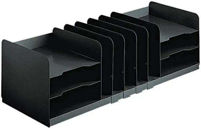 Organizer includes three letter-size horizontal compartments on each side with five adjustable vertical compartments in the center. 11 total filing slots allow maximum storage. Closed back prevents documents from sliding out the back so there's no need to place it against a wall. Desktop organizer easily holds folders, forms, magazines, reports, catalogs, sales orders, proposals, and a combination of files. Heavy-gauge steel has a scratch-resistant, chip-resistant finish. Nonskid, nonmar rubber feet protect worksurfaces.
