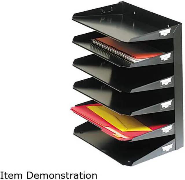 Horizontal organizer keeps important papers at your fingertips with multiple, horizontal file trays. Each tray features an ID label holder to customize trays and identify documents without taking them out of the organizer. Organizer easily holds many combinations of files, forms, magazines, reports, catalogs, sales orders, folders, pads of paper, proposals and mail. Predrilled holes allow easy wall mounting or attachment to partition hangers to save desktop space. Organizer is made of durable, heavy-gauge steel with a scratch-resistant, chip-resistant finish and rolled edges. Nonslip, nonmar padded bottom provides a scratch-free, secure grip.
