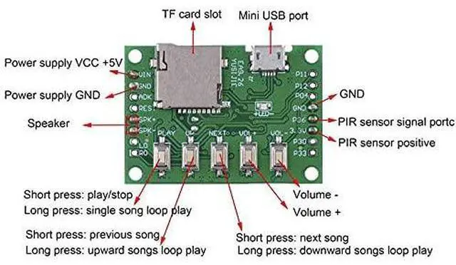 - 2. If the song is more than 4MB, you need copy the MP3 songs to TF card, then insert the TF card into the card slot of the board. When you use this way, your music will be played first after the TF card is inserted. TF card supports up to 8GB, but it is not included.