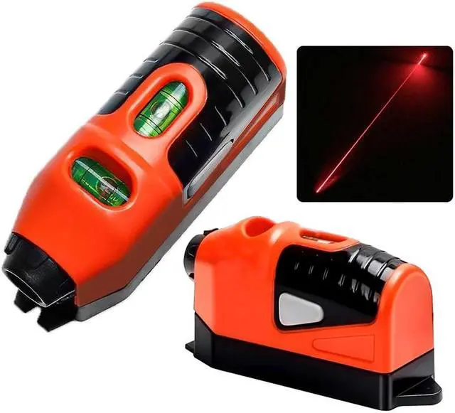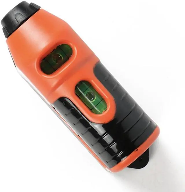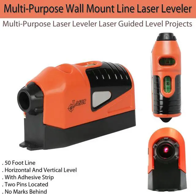 The Multi-Purpose Laser Leveler laser guided level projects a 50 foot line, has built in horizontal and vertical level bubbles, adheres to any surface and leaves no marks behind. Level requires 2 'AAA' batteries (not included). Comes with adhesive strip and two pins located in the battery compartment for convenient wall mount. Measures 4 13/16" x 1 5/8" x 2 3/8".