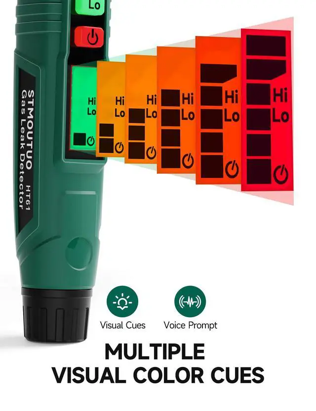 Dual Sensitivity: STMOUTUO HT61 Gas Leak Detector features high/low sensitivity modes, entering high sensitivity mode (range: 50 to 500 ppm) after 30-45 seconds of warm-up.