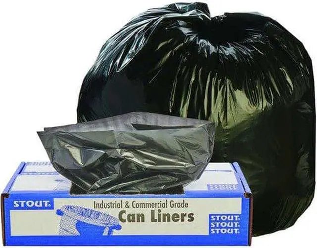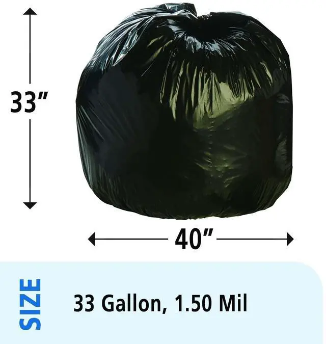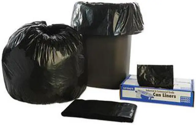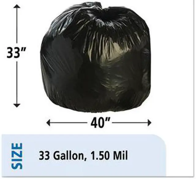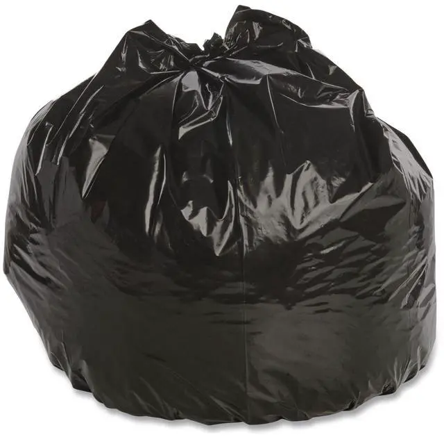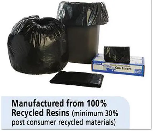 Take out the trash, but do it in an environmentally-friendly fashion. These trash bags are made with 100% recycled resin-content (30% post-consumer recycled material). The bags are designed to hold maximum amounts of trash, yet do so in an environmentally aware manner. To help avoid costly and time-consuming spills, the bags are puncture- and tear-resistant. Global Product Type - Bags-Low-Density Waste Can Liners Application - Can Liner Capacity Range (Volume) [Max] - 33 gal Thickness - 1.5 mil Grade - Extra-Heavy Material(s) - Linear Low-Density Polyethylene Width - 33 Height - 40 Color(s) - Brown Color(s) - Black Capacity (Weight) - 75 lbs Pre-Consumer Recycled Content Percent - 30% Post-Consumer Recycled Content Percent - 70% Total Recycled Content Percent - 100%
