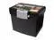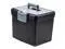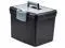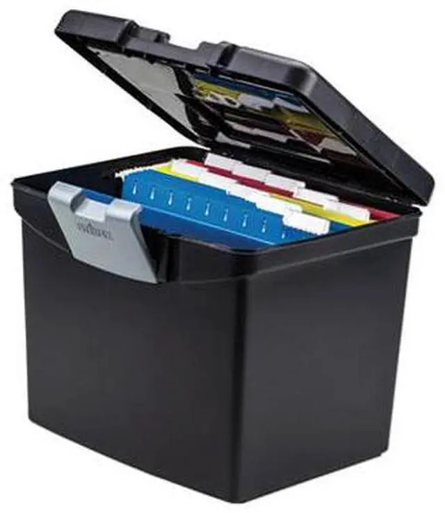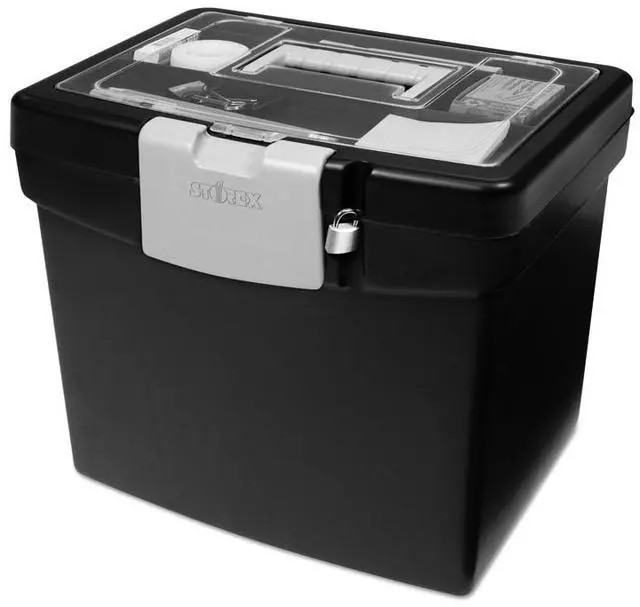 This file box has an extra large storage lid for all of your supplies. It holds 5% more hanging letter files and folders than our old box. It features a clamping latch which shuts the lid safely and, for added security, it also accepts a padlock. Box Type: File Tote; Strength: Medium-Duty; Interior Volume Capacity: 0.9 cu ft; Capacity (Weight): 35 lb.