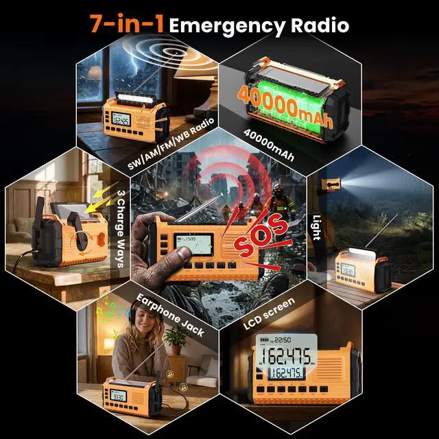 Emergency Weather Radio - AM/FM/NOAA Hand Crank Radio with 15W Fast Charge, 40000mAh Portable Solar Power Bank, Multi-Function Flashlight & SOS Alarm for Outdoor Indoor Emergencies (Orange)