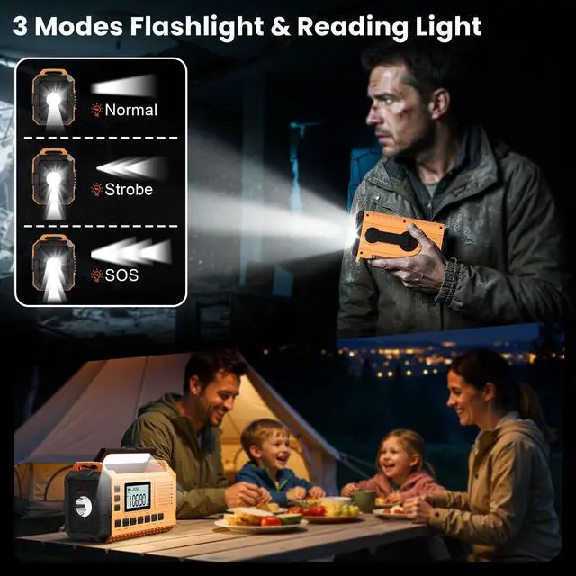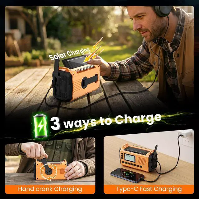 Multiple Charging Methods to Maintain Power Hand-crank, solar charging, TYPE-C charging. TYPE-C charging is the main power source for daily use, and hand-crank and solar charging methods can regenerate enough power in the dark or outdoor emergencies.Give you multiple charging options in an emergency